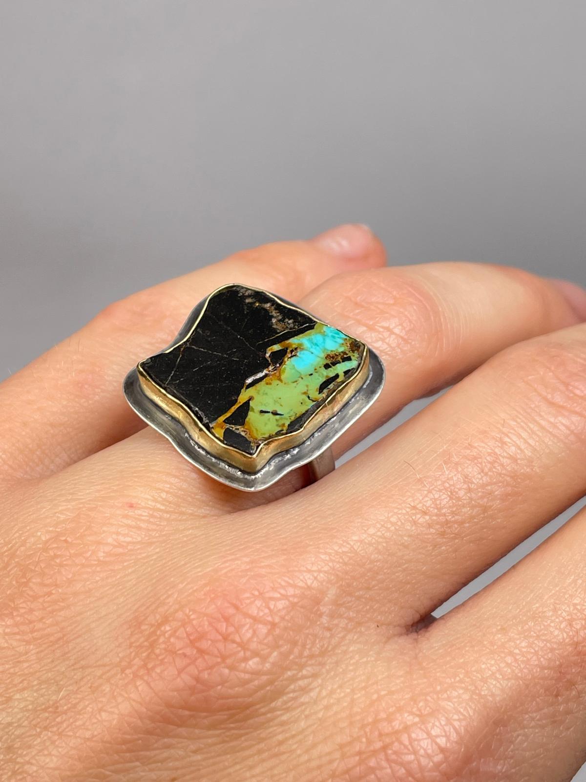 • Self cut and polished old Royston Turquoise with a 14k Gold bezel with a Sterling shank