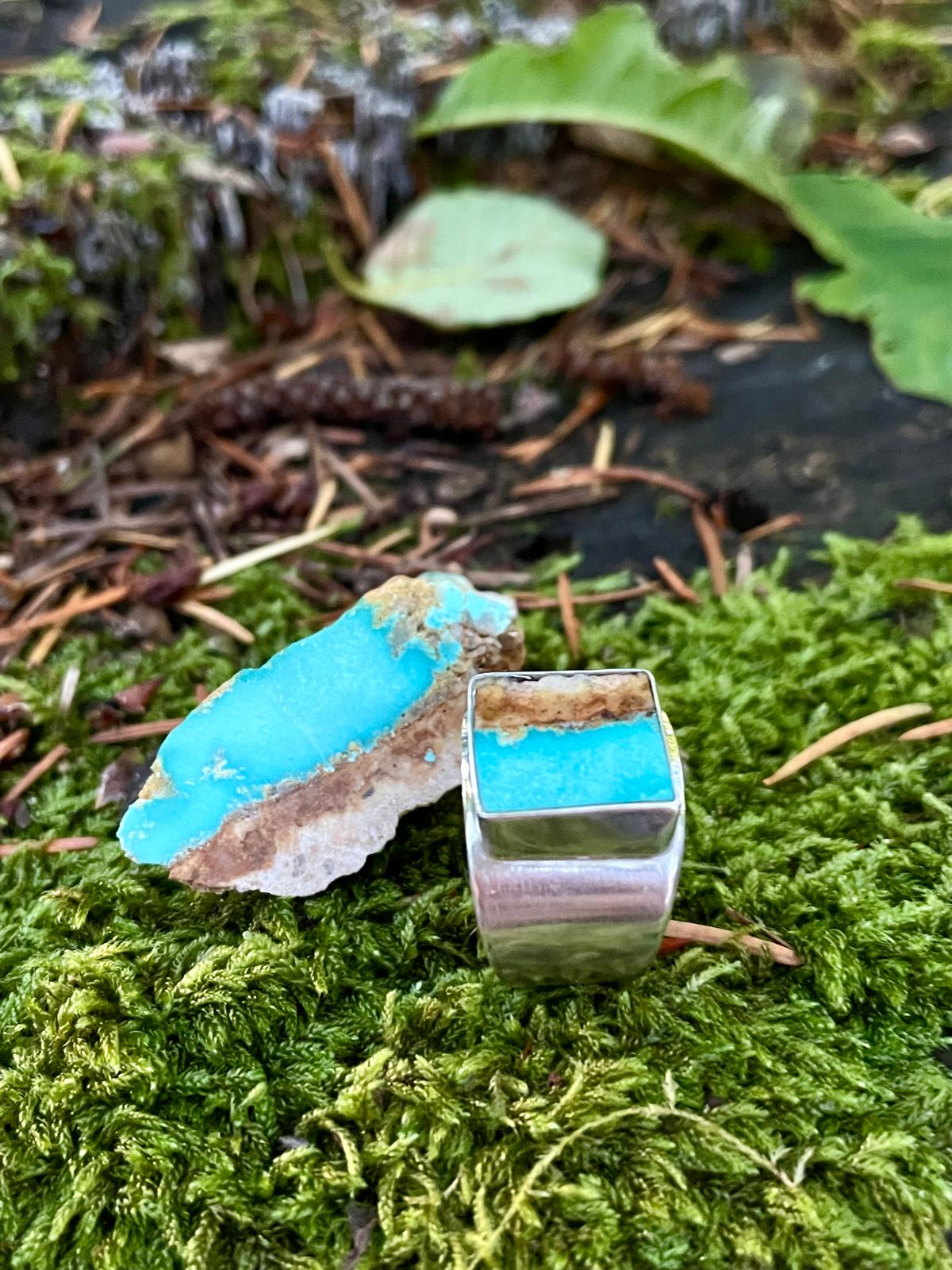 • Hand fabricated Sterling Silver Signet style ring with American mines inlay Turquoise