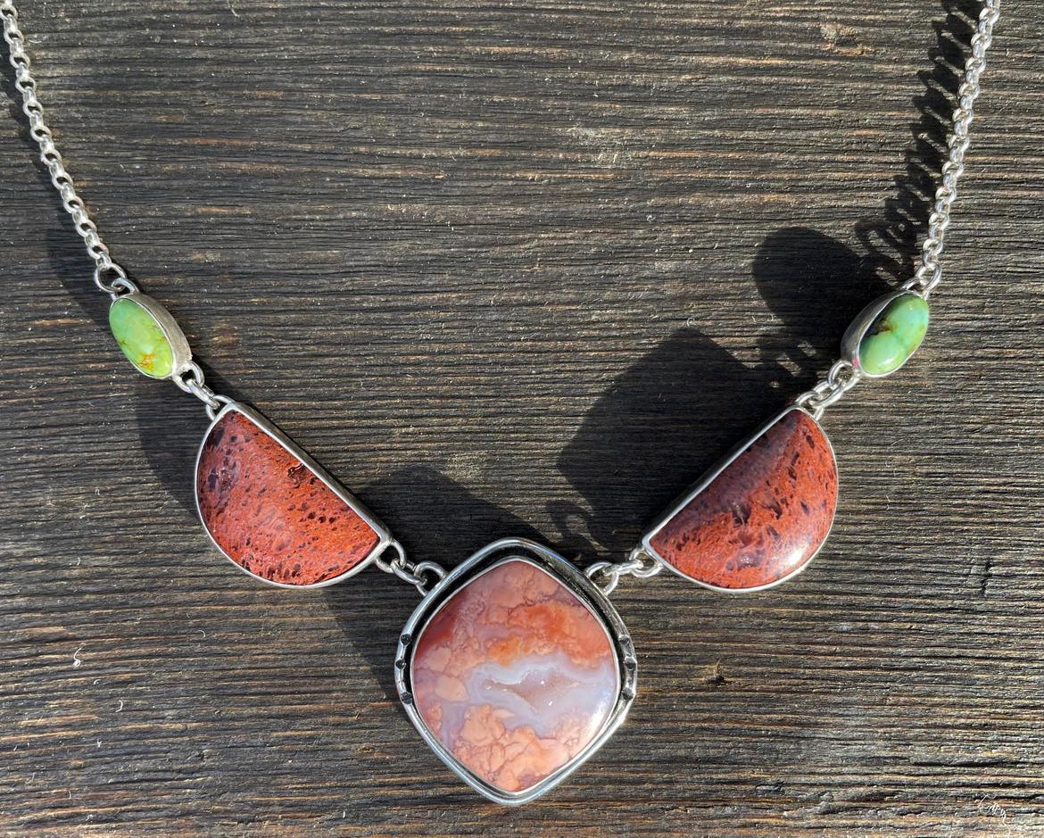 • Statement Necklace made with high grade Red Moss, and Cotton Candy Agate cut and polished by a local Lapidary Artist
