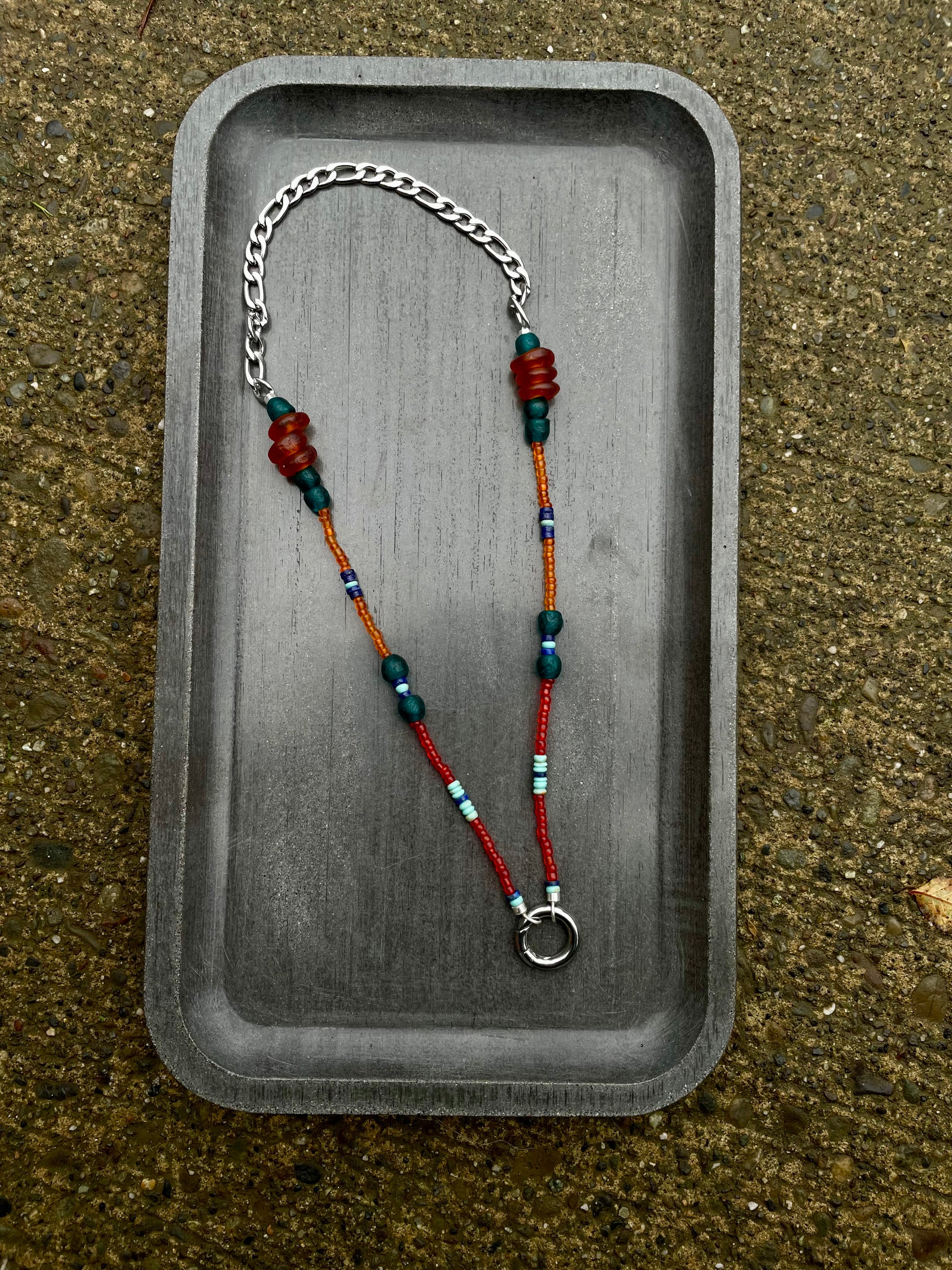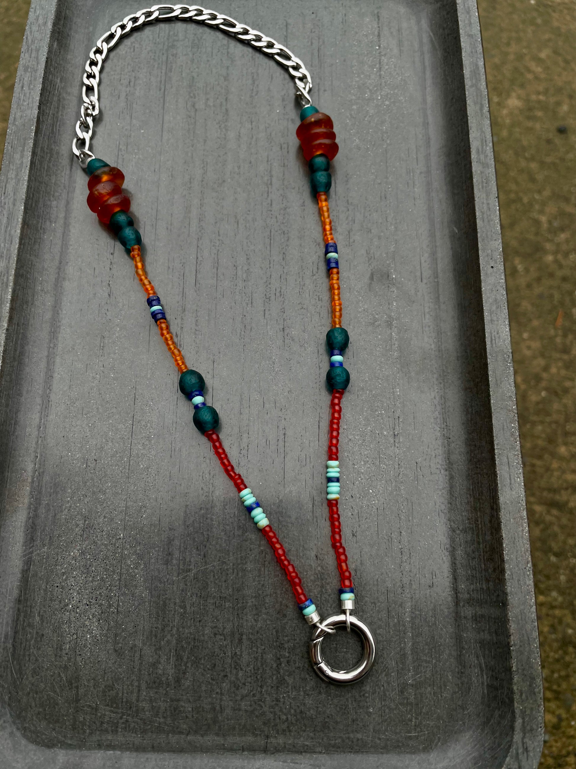 Beaded charm holder Necklaces made from Natural stones, glass and sterling beads with a Stainless steel push clasp and chain.